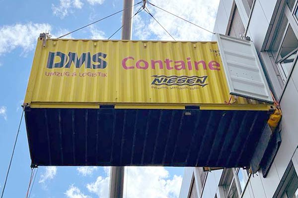 Um den umfangreichen Umzug im Zeitrahmen bewältigen zu können, setzte NIESEN ebenfalls auf »schwere Maschinerie« und nutzte sein bewährtes Kran-Containersystem. Dabei lassen sich die Transportcontainer mittels Schwerlastkran von außen an die Zieletagen der Immobilien heben. Durch die Fenster können die Container beladen und entladen werden. Das geht weitaus schneller und ist schonender als der Transport des Umzugsguts durch Flure und Treppenhäuser. Auch größeres und schweres Transportgut kann so gut gehoben werden.