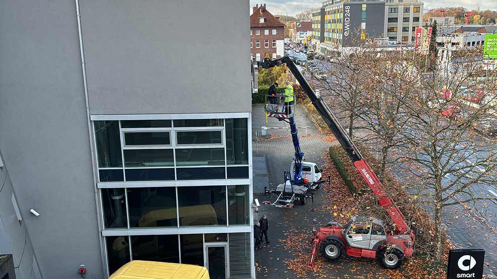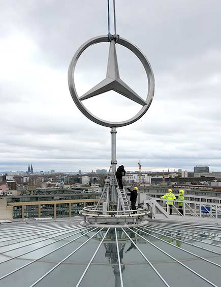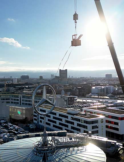 Prägend für das Erscheinungsbild des alten Mega-Standorts in Köln war der große, leuchtende Mercedes-Stern. Das Bauteil misst stolze zwölf Meter in der Höhe, sieben Meter im Durchmesser und bringt etwa vier Tonnen auf die Waage. Im Zuge des Umzugs wurde es von NIESEN mit einem Spezialkran abgenommen – ein technisches Präzisionsmanöver, das von der Schwerlastabteilung unter Leitung von Jürgen Liethen umgesetzt wurde. Die Aktion sorgte nicht nur vor Ort für Aufmerksamkeit, sondern fand noch am selben Tag bundesweit ihren Weg in die Medien.
