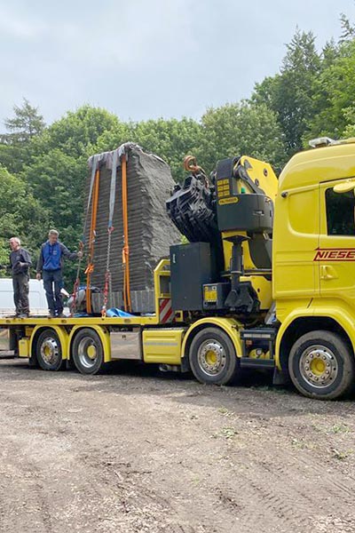 Im Skulpturenpark nahm sich der Logistiker nochmals vier Tage Zeit, um sämtliche Skulpturen punktgenau zu platzieren. Teils war der Bau provisorischer Fahrstraßen aus Metallplatten nötig, um mit den tonnenschweren Exponaten alle Stellen im Gelände zu erreichen. Der waldige und grasige Boden konnte so geschont und verstärkt werden.