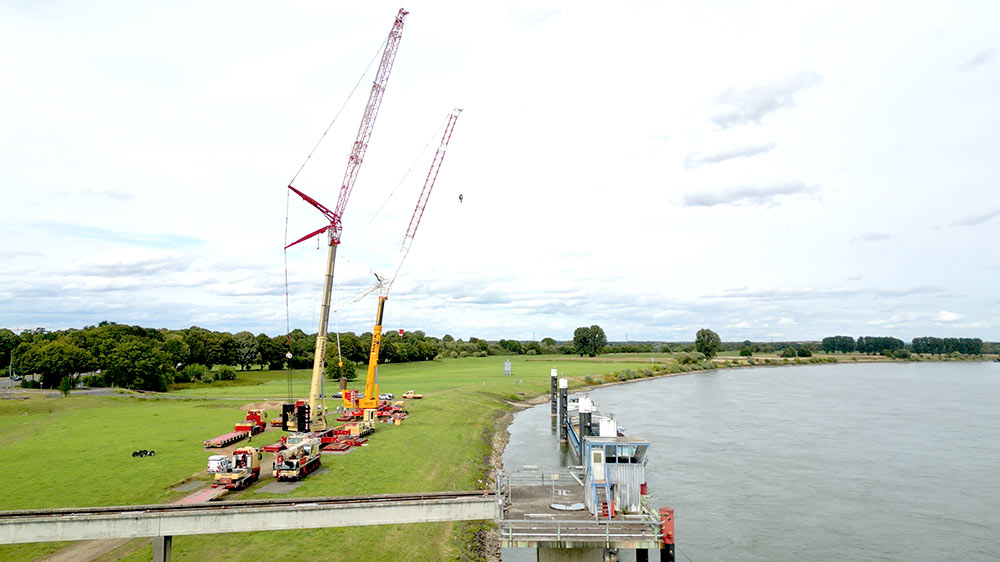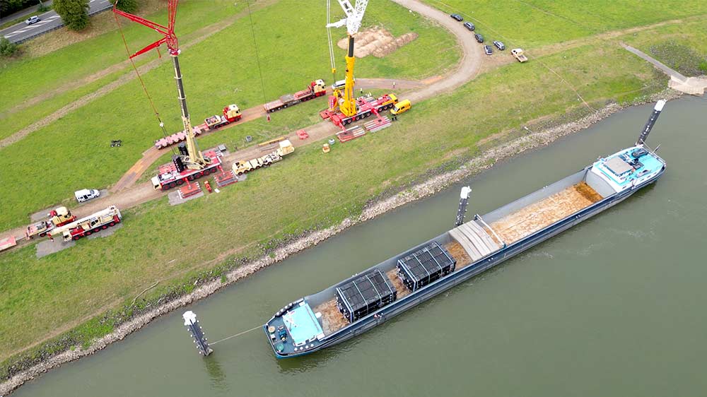 Besondere technische Präzision war beim Einsatz der Schwerlastkrane gefragt. Ein 650-Tonnen- sowie ein 450-Tonnen-Kran übernahmen den Umschlag – mit enormen Punktlasten, die vor allem im Bereich der Uferböschung sicher abgefangen werden mussten.